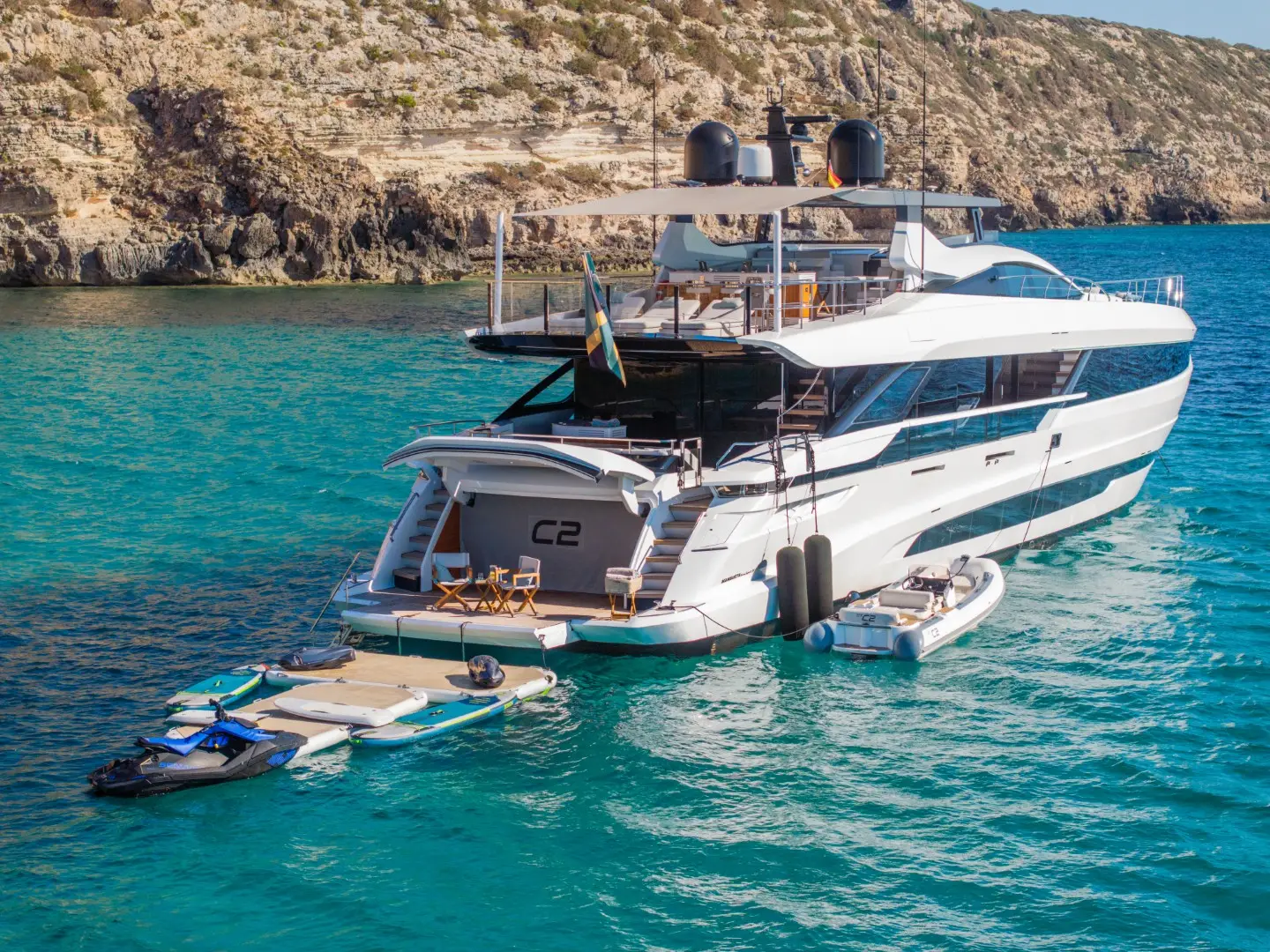Discover the allure of C2, one of the most sought-after superyachts in the Western Mediterranean. Immerse yourself in unparalleled 7-star service, expansive indoor-outdoor living, and a world-class water sports program. From sunrise cruising to sunset celebrations, every moment aboard C2 is curated for extraordinary charter experiences.