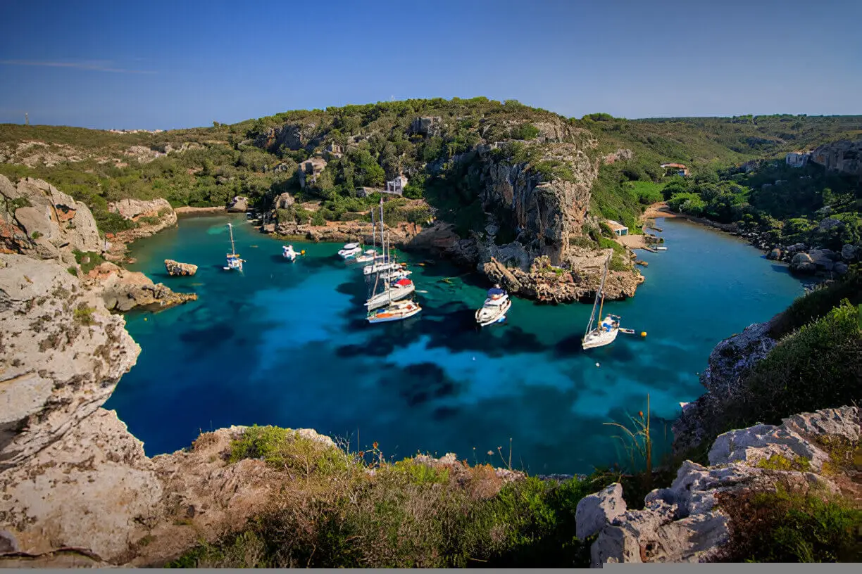 Drop anchor at Cala Macarella, a pristine sweep of white sand embraced by limestone cliffs and crystalline waters ideal for snorkelling. For a deeper sense of seclusion, set course for Cala Pregonda, where rust-toned sands and sculpted rock formations create an otherworldly backdrop unlike anywhere else in the Balearics.